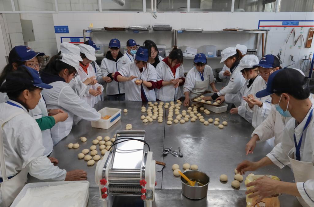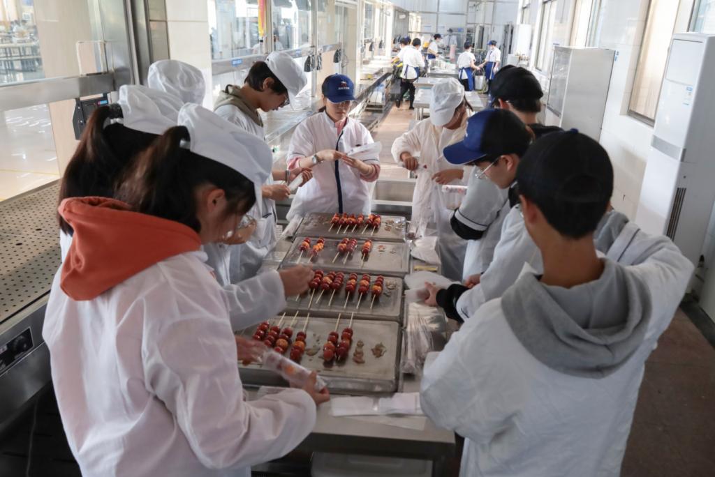 洗净山楂,用竹签串成串,熬制糖液,最后再在山楂上均匀地蘸上一层糖浆,一支精美的糖葫芦就“现身”了。“虽然开始有点手足无措,但在大家共同努力下慢慢就进入状态了。”设计类专业2022级(4)班的徐珈妮在食堂师傅的指导下第一次成功做出了糖葫芦。“希望学长学姐们收到礼物时能有一个好心情,最后带着我们的祝福走进考场。”