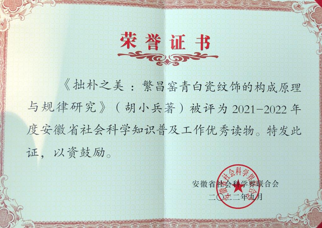 9月15日,安徽省第十八届社会科学知识普及活动月开幕式在黄山市举办,Beat365官方网站教授胡小兵新作《拙朴之美:繁昌窑青白瓷纹饰的构成原理与规律研究》(中国陶瓷2022年第三期刊载)被评为“安徽省社会科学知识普及工作优秀读物”。