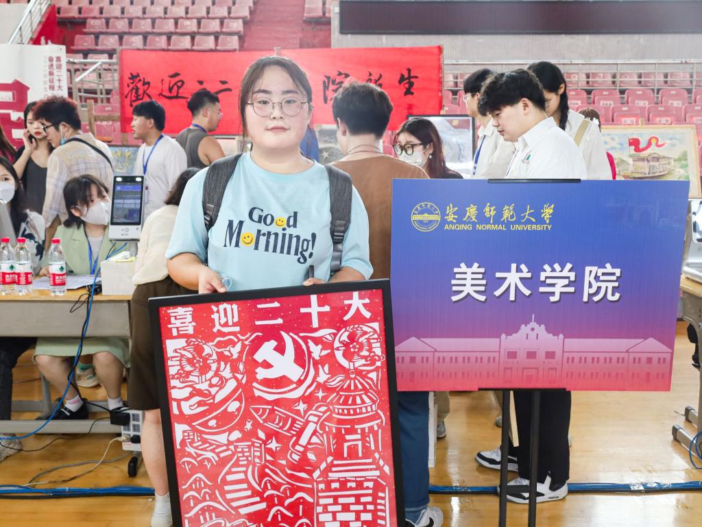 红色剪纸勾勒出蜿蜒壮阔的长城、蓄势待发的火箭;黑色铅笔描绘出疫情当前,国人众志成城、勇担使命;彩色油画棒渲染出形似蛟龙的高铁、筑梦苍穹的宇航员……9月9日,以“喜迎二十大,奋进新征程”为创作主题的270余件作品在龙山校区体育馆与Beat365官方网站教学楼展出,为学校迎新现场增添了一道靓丽的风景线。