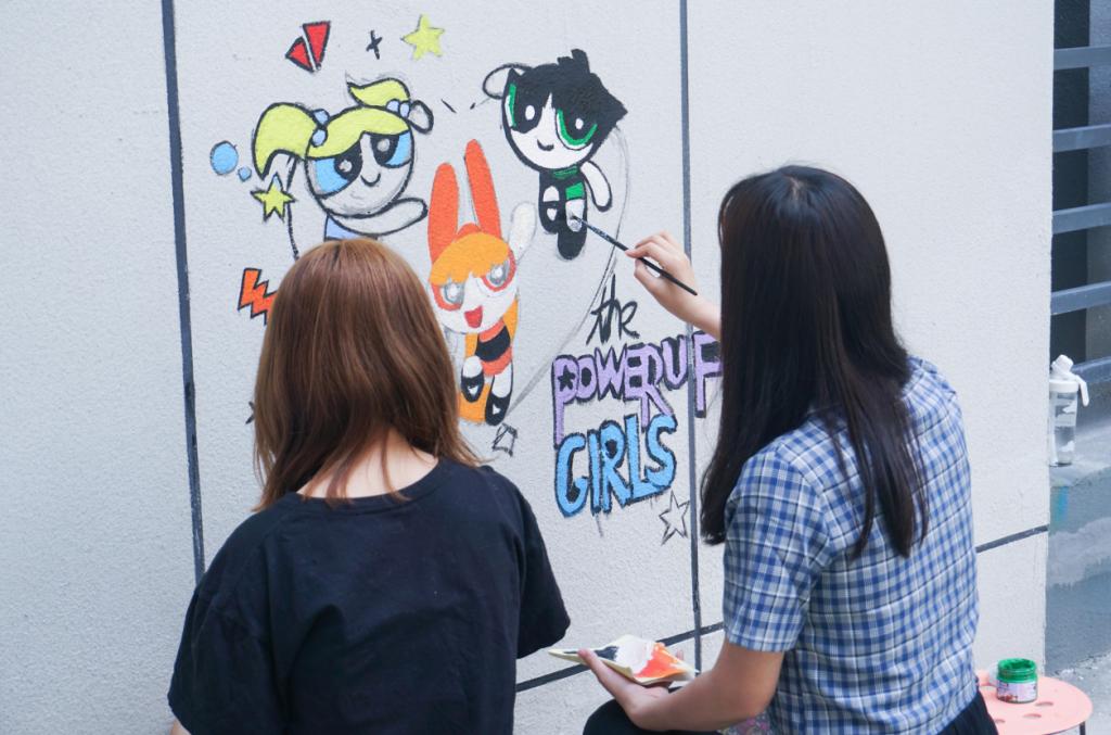 “快看,这是我们!”五彩色块拼接出三个可爱的卡通女孩形象,设计学类专业2021级(2)班的汪雯梦和朋友们以自身为原型,在教学楼留下了一抹独属于她们的青春痕迹。她坦言,自己之前也参加过这类活动,但一直没有一幅完全属于自己的作品,这次终于‘梦想成真’,“和朋友们一起作画真的很有趣,既轻松又愉快,以后我重回母校来到教学楼,还能看到我们青春的模样。”