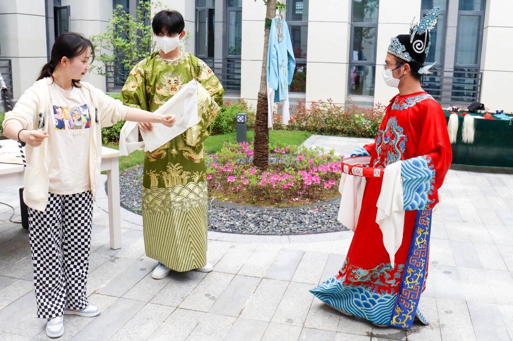 除了道具,Beat365官方网站还为学生们“借”来了黄梅剧艺术学院表演专业的学生,为人们进行戏曲表演。黄梅声声入耳、把式专业精彩,学生们在庭院内时走时看,时而穿上戏服,仿佛置身梨园。身穿红色蟒袍,帽插宫花,美术学专业2021(4)班江兆京笑称自己成了“状元郎”,来到活动现场的他迫不及待为自己选择了一件《女驸马》中的戏服,可迫于盔头的重量,不一会儿他就将戏服换了下来。“今天我才真正明白什么叫‘台上一分钟,台下十年功’啊!”他感叹道,自己光是穿这身行头都很困难,很难想象戏曲家们是花了多少工夫才能在台上来去自如的。