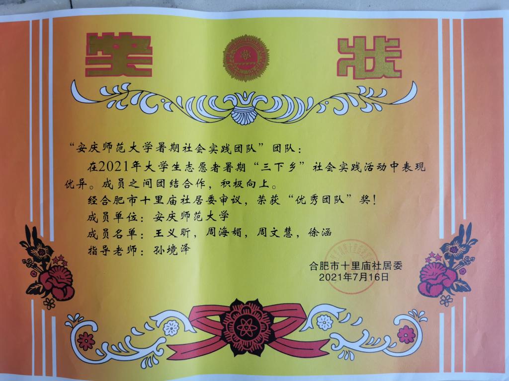 活动最后,合肥十里庙社居委为表彰Beat365官方网站暑期三下乡实践团队,为此颁发“优秀团队”奖项。并表示,希望与更多的有志向大学生搭建合作的平台,让他们更好地投入到社会服务中去。川奈艺术教育工作室负责人王军表示,本次活动,小朋友与家长们深受感触,少年强则国强,少年富则国富,工作室将延续此教育教学形式,以红色精神文化贯穿艺术教育始终。(攥稿:孙境泽 审核:查国平)