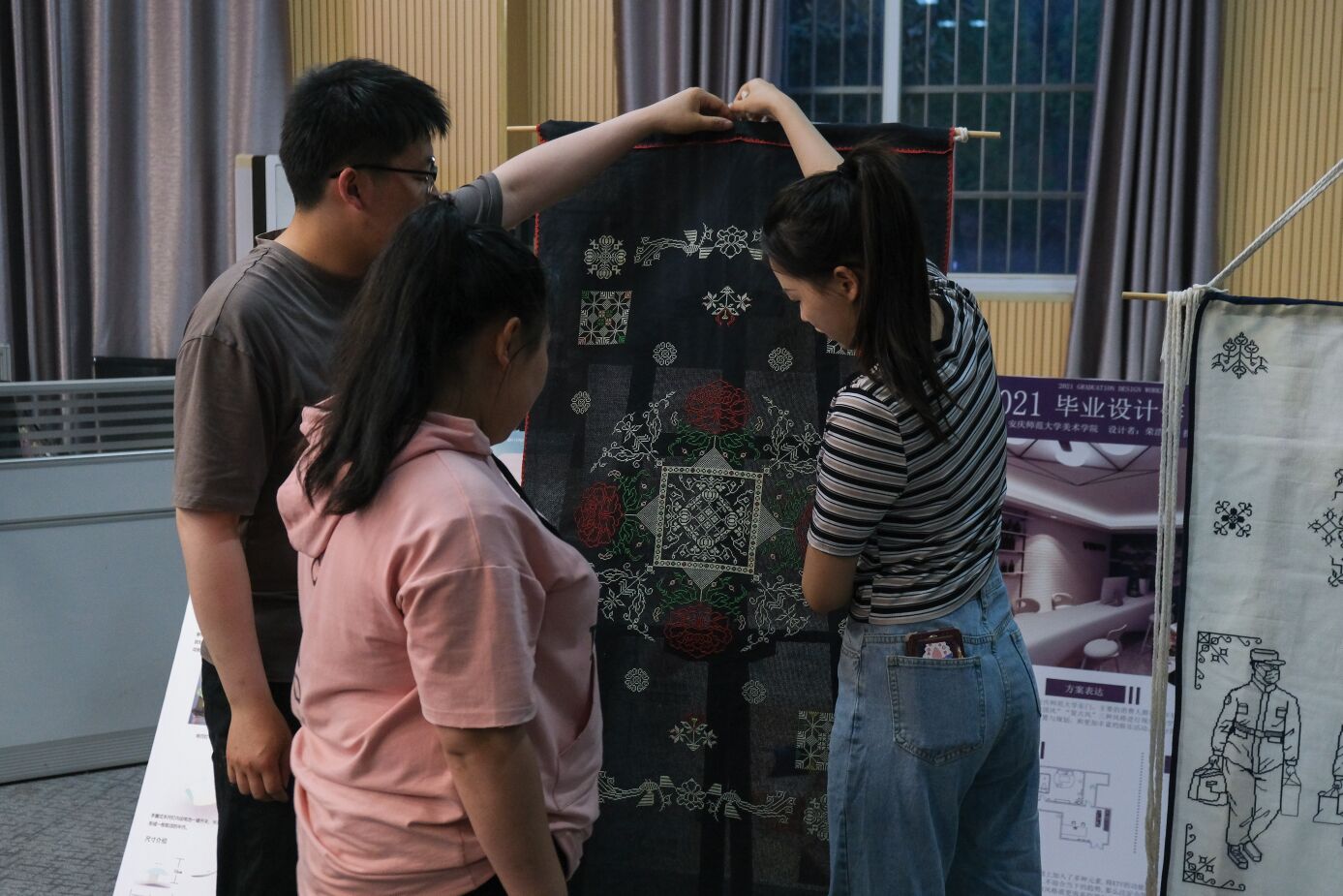 “这是一幅挑花作品,运用了我们安庆特有的望江挑花工艺。”美术学专业2018(4)班的许竟介绍,作品主要是为建党100周年所设计完成的,大红的牡丹、金色的南瓜以及代表着“福气”的蝴蝶,多元素的使用,祝福祖国繁荣昌盛。他谈到,挑花作品讲究对称和正反一致,“两面花”是挑花作品的一大特色。