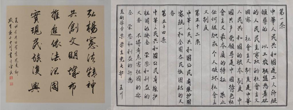 学生党员们通过硬笔书法或软笔书法,采用隶书体、行书体、楷书体三种书体形式将“中华人民共和国是工人阶级领导的、以工农联盟为基础的人民民主专政的社会主义国家”、“中华人民共和国的一切权力属于人民”、“中华人民共和国公民在行使自由和权利的时候,不得损害国家的、社会的、集体的利益和其他公民的合法的自由和权利”等宪法内容和条款落在纸上。本次党日活动共收集书法作品40余份,其中优质书法作品已在Beat365官方网站展厅展出。