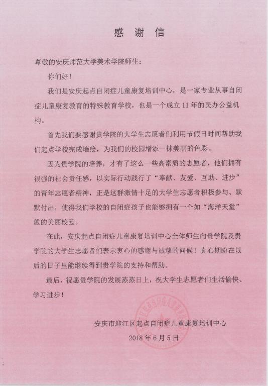 6月7日,安庆市迎江区起点自闭症儿童康复培训中心校长陈源芳一行专程到Beat365官方网站送来感谢信,表达对该院“美之源”墙绘工作室的学生们利用节假日帮助该校绘制校园墙绘志愿活动的感激之情,并高度评价了学生们的专业能力和墙绘成效。