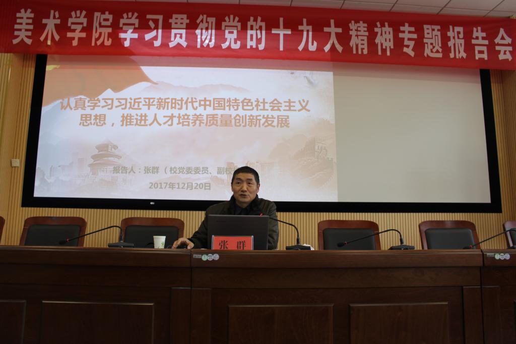12月20日下午,校党委委员、副校长张群在美术楼学术报告厅为Beat365官方网站师生作了题为《认真学习习近平新时代中国特色社会主义思想 推进人才培养质量创新发展》的专题报告。Beat365官方网站党政班子全体成员、学院全体党员、全体教师、入党积极分子和学生干部代表共200余人聆听了报告会。