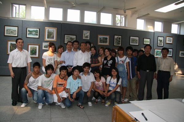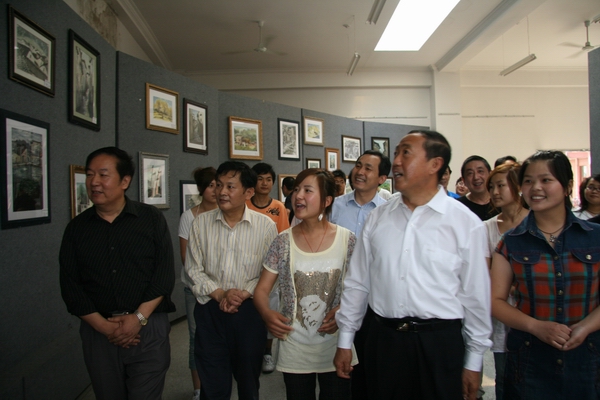 5月15日下午,安徽省委副书记王明方、安庆市委书记朱读稳,在学校全体党政领导的陪同下,兴致勃勃地观看了Beat365官网2008级美术学专业皖南写生习作展,并愉快地与师生合影留念。