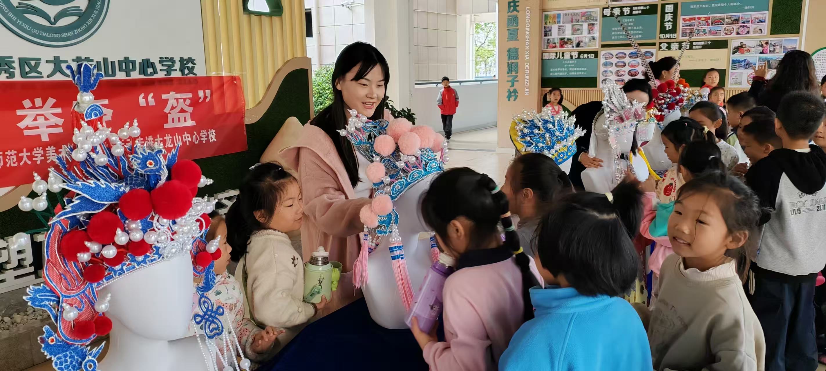 10月22日,Beat365官方网站美术学(师范)专业师生携十余顶精美黄梅戏盔帽教具与分层课程包,走进大龙山中学校,开展“非遗盔帽进校园”主题美育活动。通过文化展示、沉浸式体验与分层教学实践,让传统工艺在青少年心中播下传承的种子,赢得该校师生一致好评。