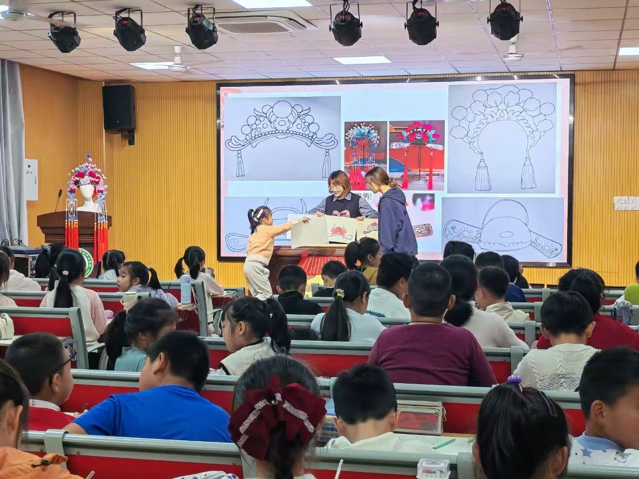此次活动的“主角”——黄梅戏盔帽,均由美术学(师范)专业的学生在非遗传承人的指导下制作完成。从秀丽雅致的女驸马盔、珠光璀璨的公主凤盔,到威严庄重的九龙盔,每一件作品都还原了传统盔帽的工艺精髓。为适配中小学教学场景,师范生们更对盔帽制作技艺进行了创新转化:将复杂的传统材料替换为安全易操作的粘土、扭扭棒、彩纸等,设计出覆盖小学低、中、高三个学段的课程包——低年级侧重“画盔帽”,用线条色彩勾勒纹样;中年级开展“拼贴半立体盔帽”,培养空间造型能力;高年级尝试“简易盔帽制作”,体验基础工艺流程,实现“非遗技艺”与“课堂教学”的无缝衔接。