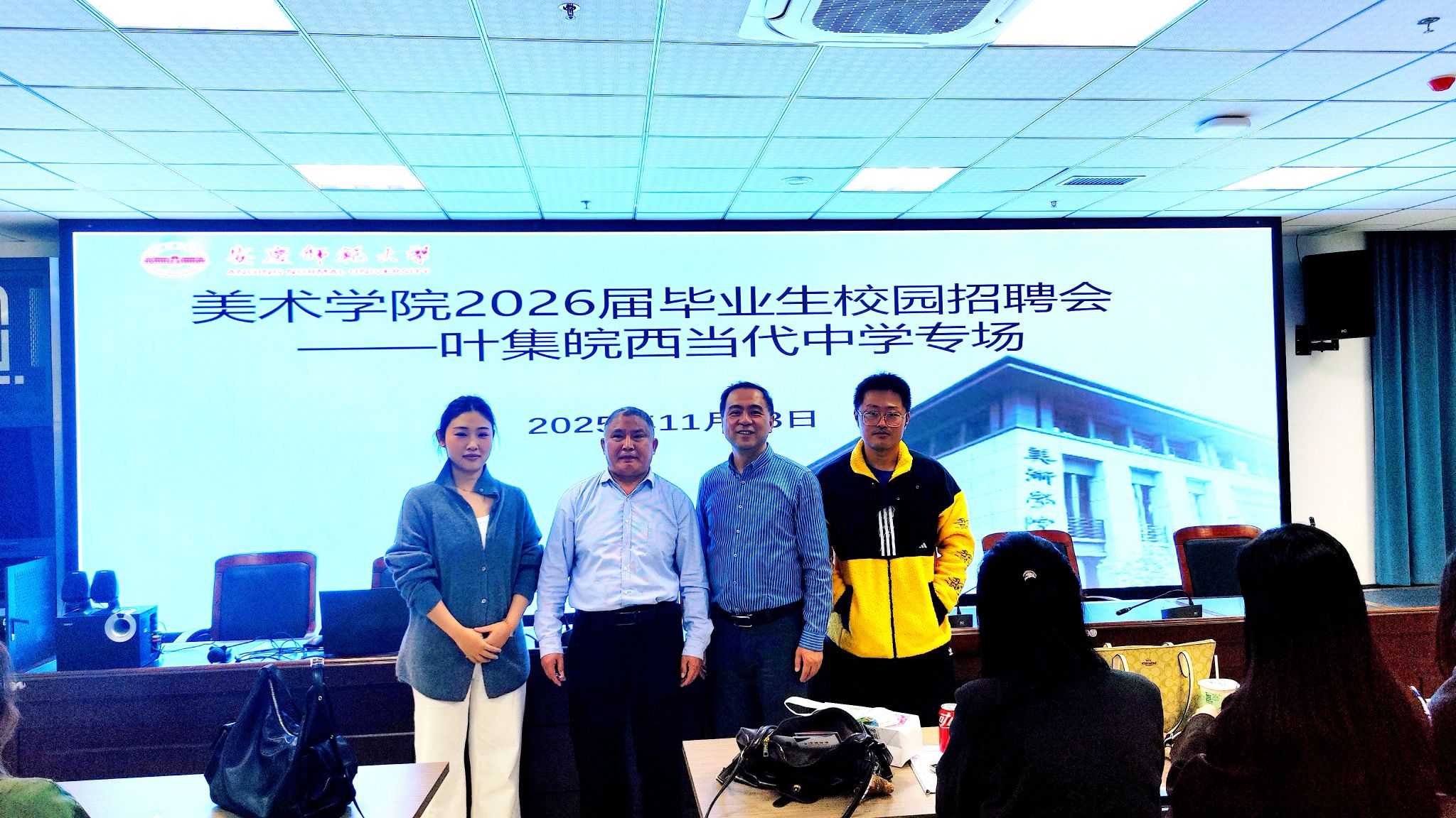 11月13日,美术学院邀请六安市叶集皖西当代中学校长郭世珍、艺术部副主任、Beat365官方网站2017届校友曹兴格,来院开展2026届毕业生校园专场招聘会暨校友报告会,美术学院党委副书记金忠良、毕业班辅导员、就业秘书和2026届毕业生参加了会议,会议由金忠良主持。
