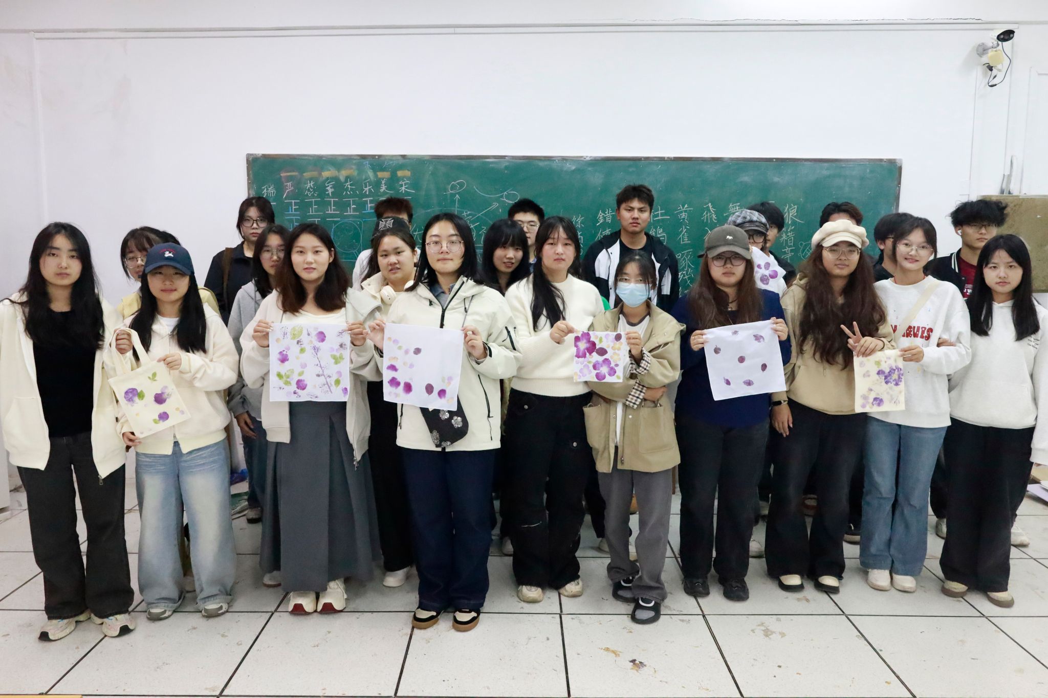 材料预处理、创意排版、固定敲击、固色晾晒……活动现场,学子们取出提前用明矾水浸泡35分钟的新鲜花材与叶片,将其表面的水渍轻轻擦干,随后在布料上精心构思排版。有的以热烈的红玫瑰为中心,辅以错落有致的翠绿蔷薇叶,打造主次分明的构图;有的偏爱淡雅风,将粉佳人、蓝星花与红花檵木叶穿插排列,晕染出清新层次感;还有同学大胆尝试撞色,让橙铃铛的明艳与红花檵木的紫褐形成鲜明对比,尽显创意巧思。