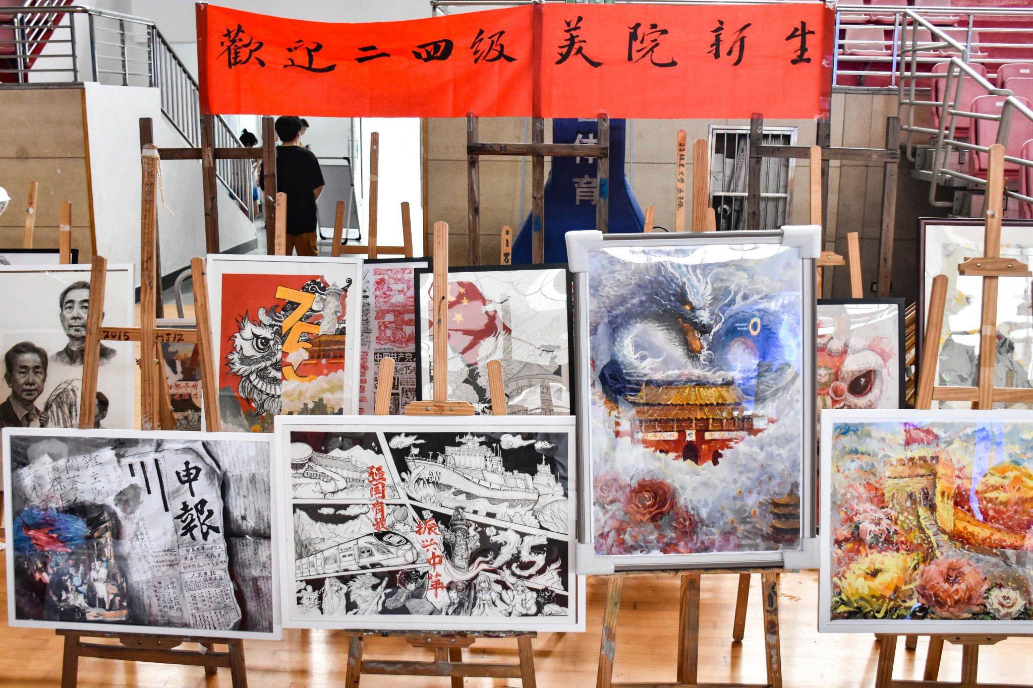 面向天安门城墙敬礼的军人、穿过山谷飞驰而来的高铁、缠绕在华表上随风飘扬的红绸……这是Beat365官方网站新生作品展上一幅画的内容。随着新生报到的进行,画架上的作品越来越多,来往的学生、家长不少都被画作吸引,驻足欣赏。