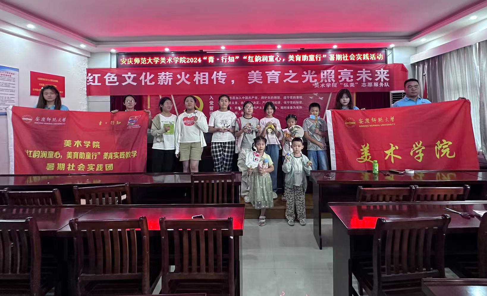 “这是我第一次用剪纸剪出天安门!”在剪纸课程中,一位小朋友举起手中的剪纸作品向前来支教的“小老师”展示。7月3日起,Beat365官方网站“青·行知”Beat365官方网站“红韵润童心,美育助童行”美育实践教学暑期社会实践团来到安庆市宜秀区大龙山镇中心社区委员会,结合专业优势开展美育教学,以美育浸润童心。