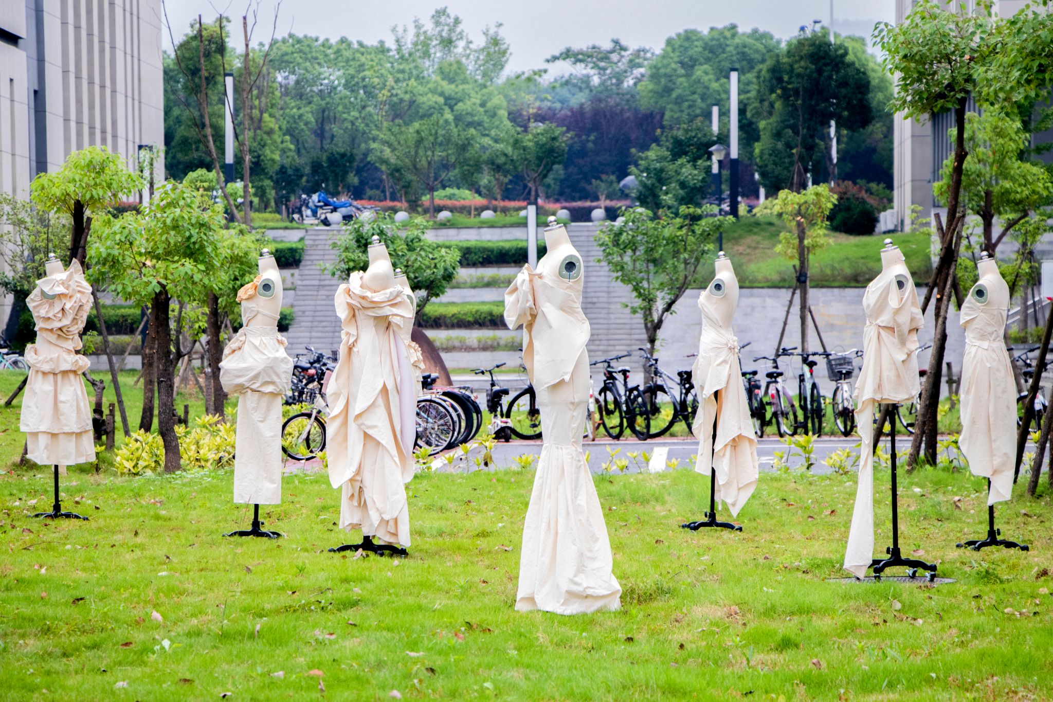 在双龙湖畔的草坪上,摆放着10余件利用人台进行展示的纯色礼服。艺术节“打卡”之旅刚开启,这组礼服的照片便“刷屏”众多学生的朋友圈。“这是由我们设计的作品,我很高兴看到它们被大家所喜爱。”服装与服饰设计专业2022级留学生阿玛尼表示,这是她第二次在学校参与湖畔艺术节,对于自己的作品能在艺术节上展出,她感到十分自豪。