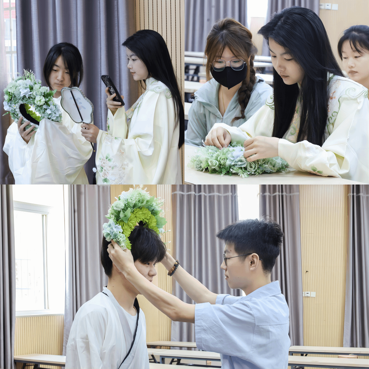 拍摄结束后,摄影俱乐部的成员也纷纷加入体验簪花文化的行列中。他们放下拍摄工具,穿上提前准备好的汉服,为彼此挑选并佩戴簪花头饰,在享受簪花乐趣的同时“零距离”欣赏这一传统工艺的魅力。