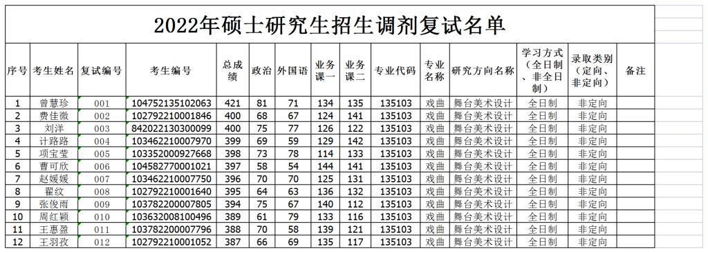 戏曲专业舞台美术设计方向调剂志愿复试于2022年4月14日下午14:30进行远程设备联调联试;2022年4月15日(周五)上午9:00起,正式网络面试。