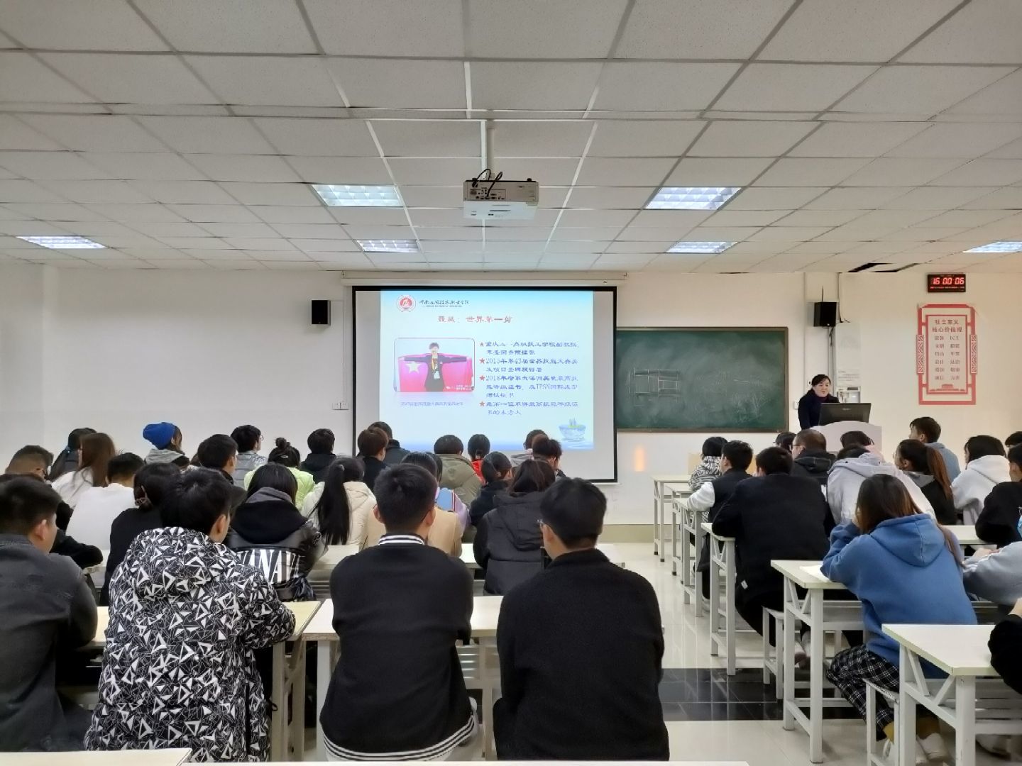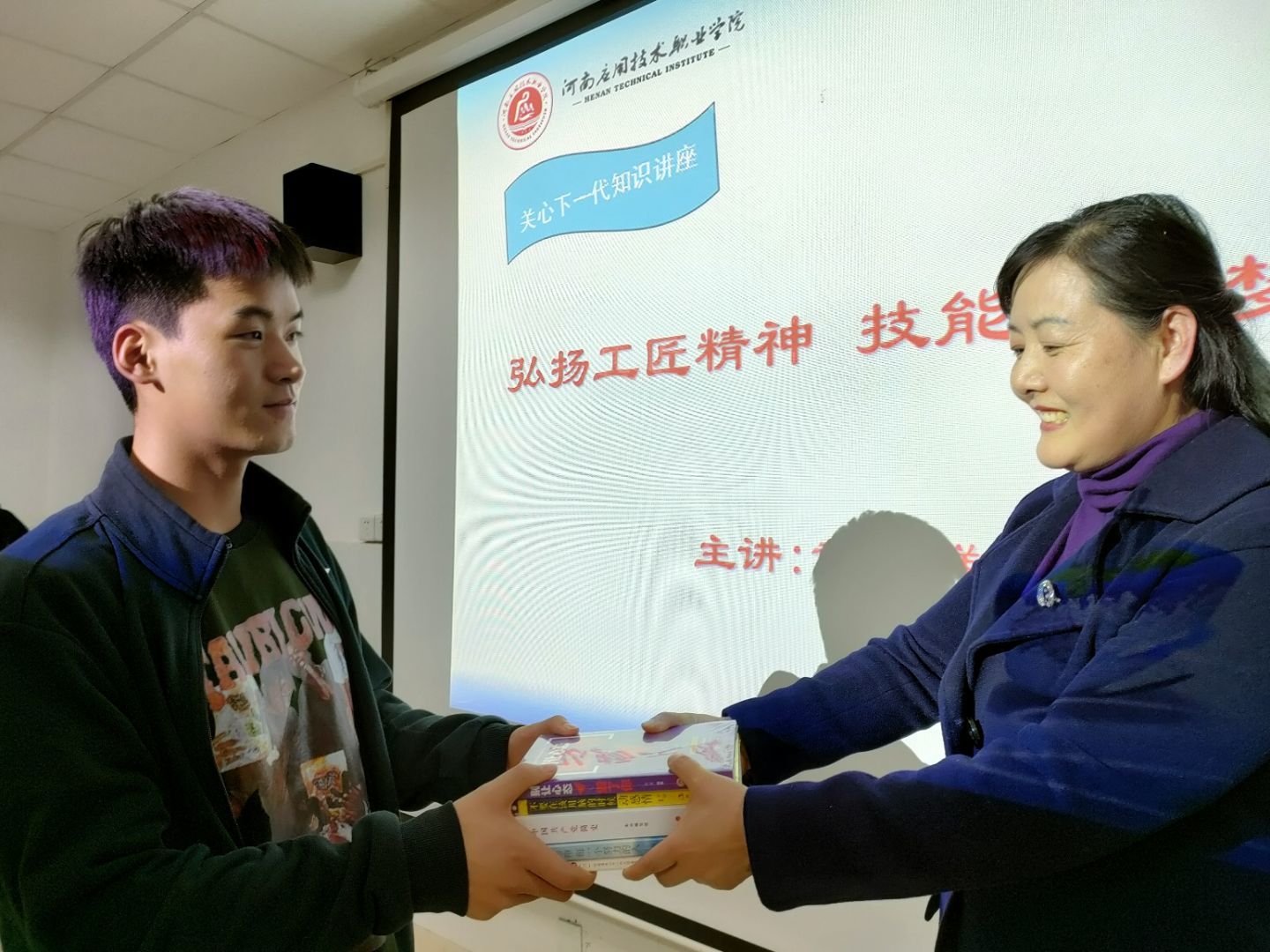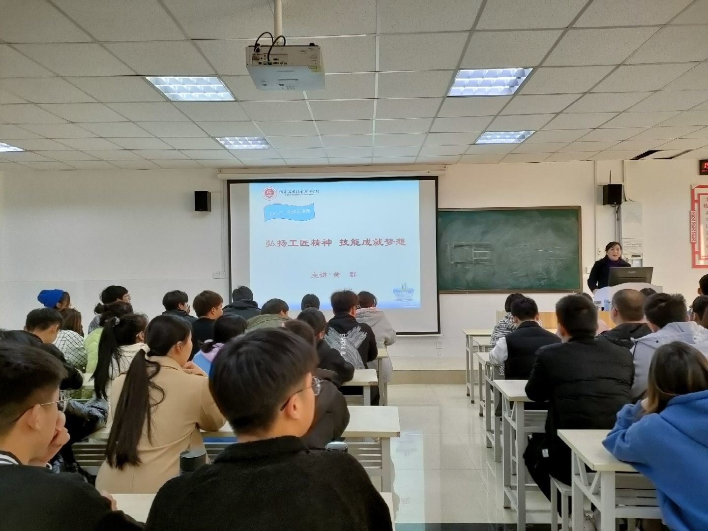 活动伊始,首先由赵源老师和徐娟老师为同学们赠予相关书籍,旨在让他们充满梦想与希望,更深入的学习、弘扬“工匠精神”;之后,黄群教授为同学们进行了一场《弘扬工匠精神 技能成就梦想》的知识讲座,主要通过讲述一些我国具有奋斗精神、工匠精神的真实事例让同学们从中获得具有工匠精神的知识与力量,并向同学们介绍了一批批优秀劳动楷模及永利官网往届优秀毕业生典范,让同学们感受到了榜样的力量,从而更加鞭策自己向大国工匠的目标奋进。在老师慷慨激昂的演讲中同学们也感慨良多,铭记于心,力求在将来的学习、生活和工作中把平凡的事干到极致。