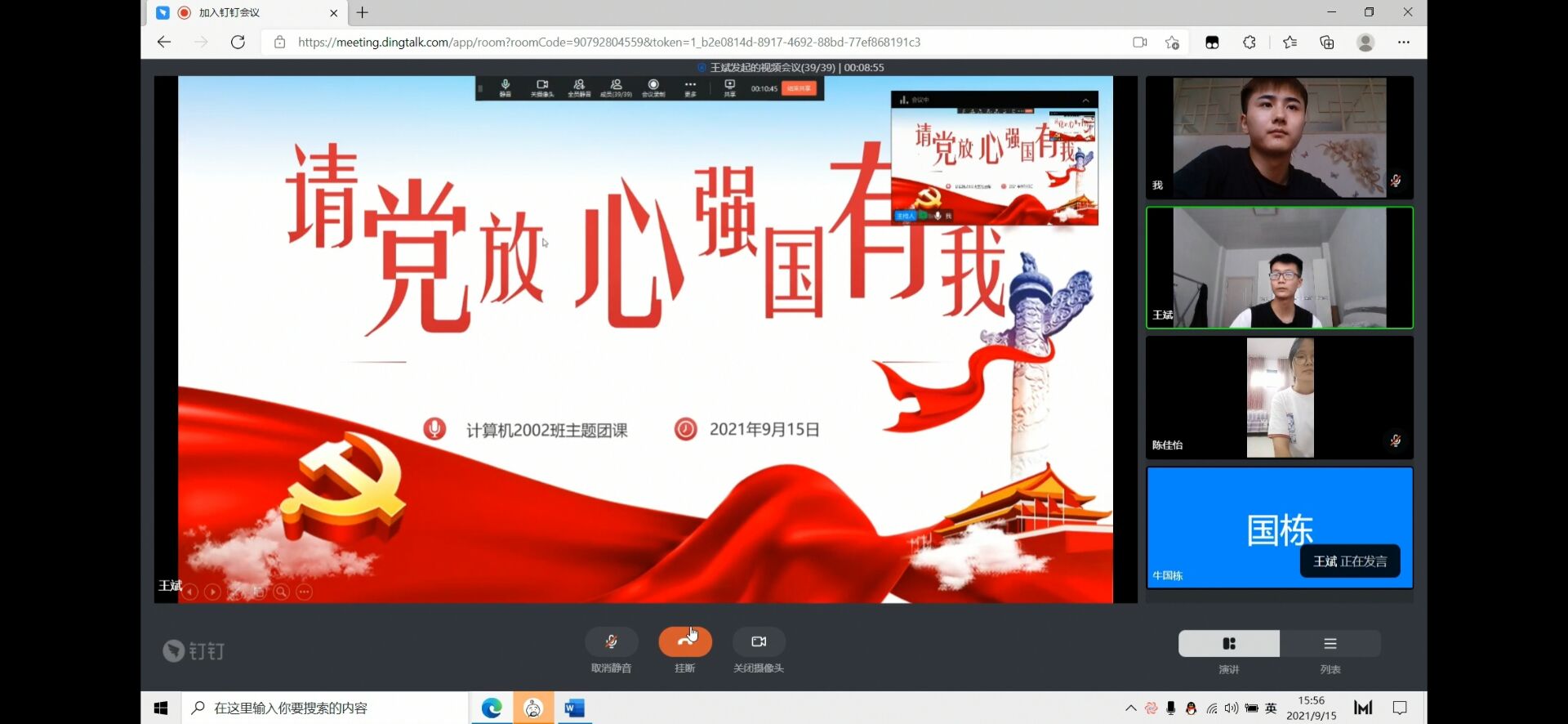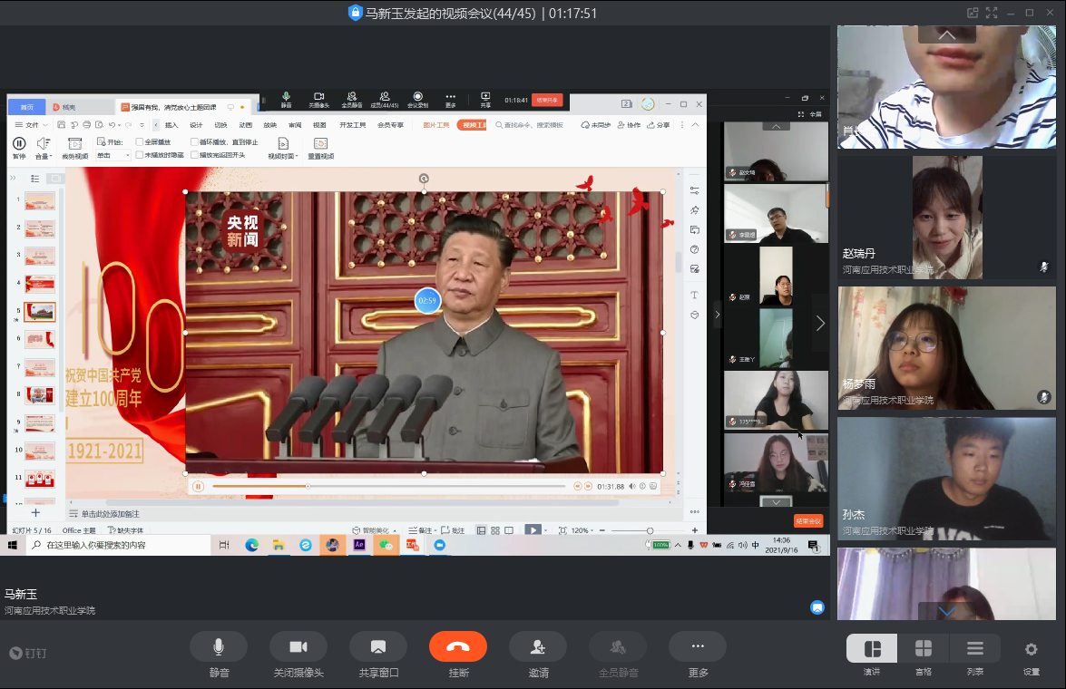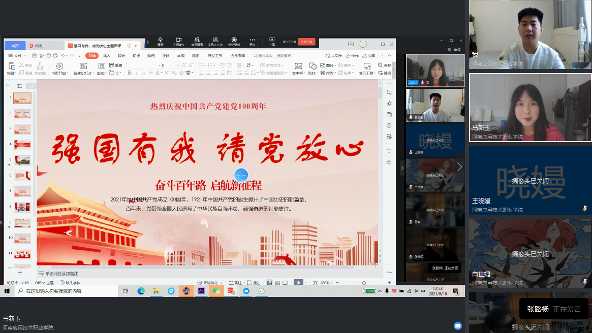 为认真学习贯彻习近平总书记“七一”重要讲话精神,引领青年团员们坚定政治信念,不断提高学生团员的思想认识,发挥青年讲师的教育引导作用,以先进典型事迹促进示范引领,yl6809永利官网团总支带领各支部积极开展“请党放心,强国有我”主题团日活动。此次团日活动以线上视频会议的形式展开,由各班团支书带领同学集中学习。