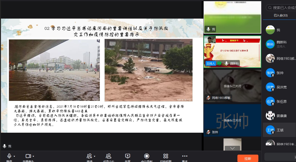 再次,各支部邀请在洪灾和水灾期间的优秀志愿者来到班级中分享他们的真实事迹,通过个人讲解和现场图片材料分享,让同学们进一步了解到深入一线同学们的艰辛和无私奉献精神。