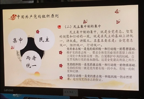 首先,杨书记从中国共产党的背景导入,党的建设必须坚持“民主集中制”,它既是党的根本组织原则,也是群众路线在党的生活中的应用。中国共产党是一个具有伟大理想和严明纪律的党,从成立的第一天起,就要求每个党员严格遵守党的纪律,不折不扣的执行党的决议。中国共产党在领导中国革命和建设的长期实践中,形成了一整套优良作风,每个要求入党的同志必须保持和发扬党的优良作风。
