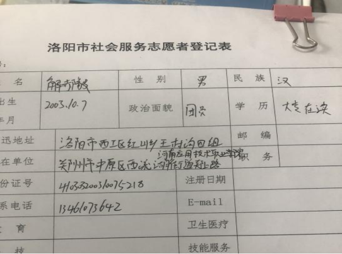解郝毅,男,计算机2102班。志愿服务时间:2022年1月9日,在本次防控疫情中他志愿加入到洛阳市社区志愿者团队。在此期间,严守工作岗位和工作内容,帮助社区的村民们登记信息,严格检查外来车辆,认真查看健康码和行程码,维持秩序等工作,力在为社区贡献自己的一份力量。