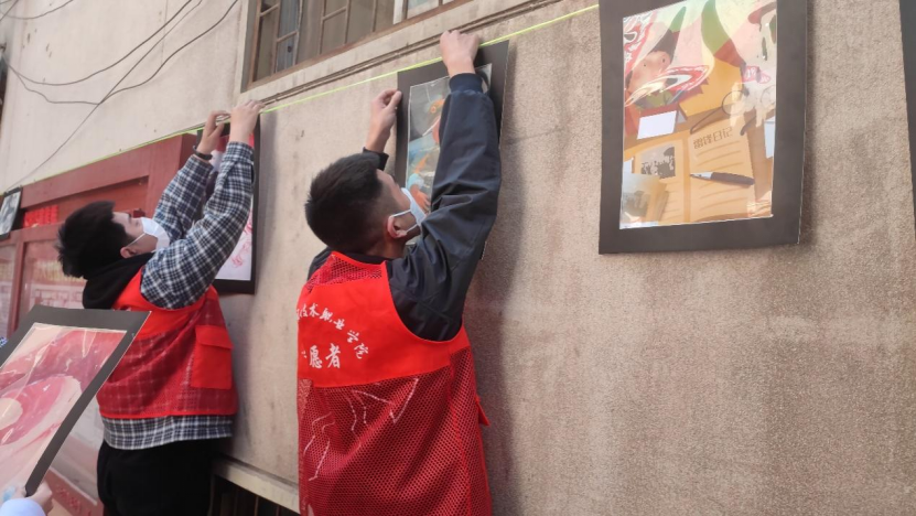 画展现场,yl6809永利官网志愿服务团队在社区工作人员的帮助下,按照各自分工,有条不紊地开始布置工作。我院志愿者主动、耐心地为前来参观的社区群众讲解作品中所传达的精神含义,宣传、弘扬雷锋艰苦朴素、助人为乐的大爱情怀,在春天播下雷锋精神的种子,让其生根发芽,发扬光大。