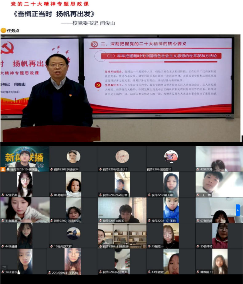 为引导学生充分认识党的二十大召开的伟大历史意义,深刻把握党的二十大精神的核心要义,鼓励永利官网青年学子努力学习,汇聚青春力量争做时代新人,落实学校关于学习党的二十大精神的相关通知,yl6809永利官网组织学生观看学校党委书记闫俊山主讲的《奋楫正当时 扬帆再出发》党的二十大精神专题思政课。