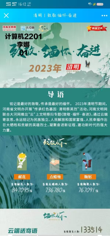 活动当天,各团支部组织全体同学,参与了“网上祭英烈”活动,并开展不同形式的主题团课。同学们纷纷通过鲜花、点蜡烛、鞠躬、留言、主题讨论等方式表达深情缅怀和无限思念。一段段留言寄托着学生们对先烈的哀思与敬仰,表达了对先烈的崇敬之心、感念之情、传承之志。