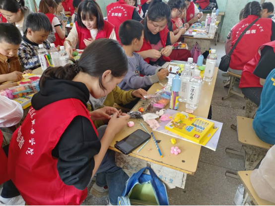 志愿者们到达黄岗小学后,分发材料,去到小朋友的班级里,带领小朋友们画画、做手工。志愿者们和小朋友共同创作,大胆挥洒手中的蜡笔,将脑海中的想象共同勾勒,颇具特色的萝卜屋、轮船、花朵、动画人物都成了小朋友们手中的主角,每个孩子都乐在其中,流连忘返。