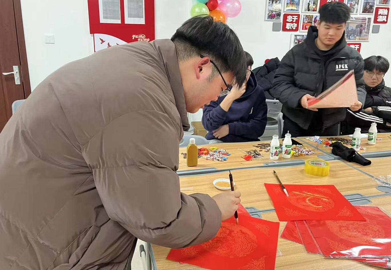 阵阵墨香指尖流, 浓浓祝福溢心间。写福字活动现场,毛笔、砚台整齐地摆放在桌子上, 鲜红的纸张渲染着浓浓的节日氛围。同学们尝试书写并创造不同的“福”字。一撇一捺,一横一竖,尽情享受挥毫泼墨带来的愉悦与幸福。