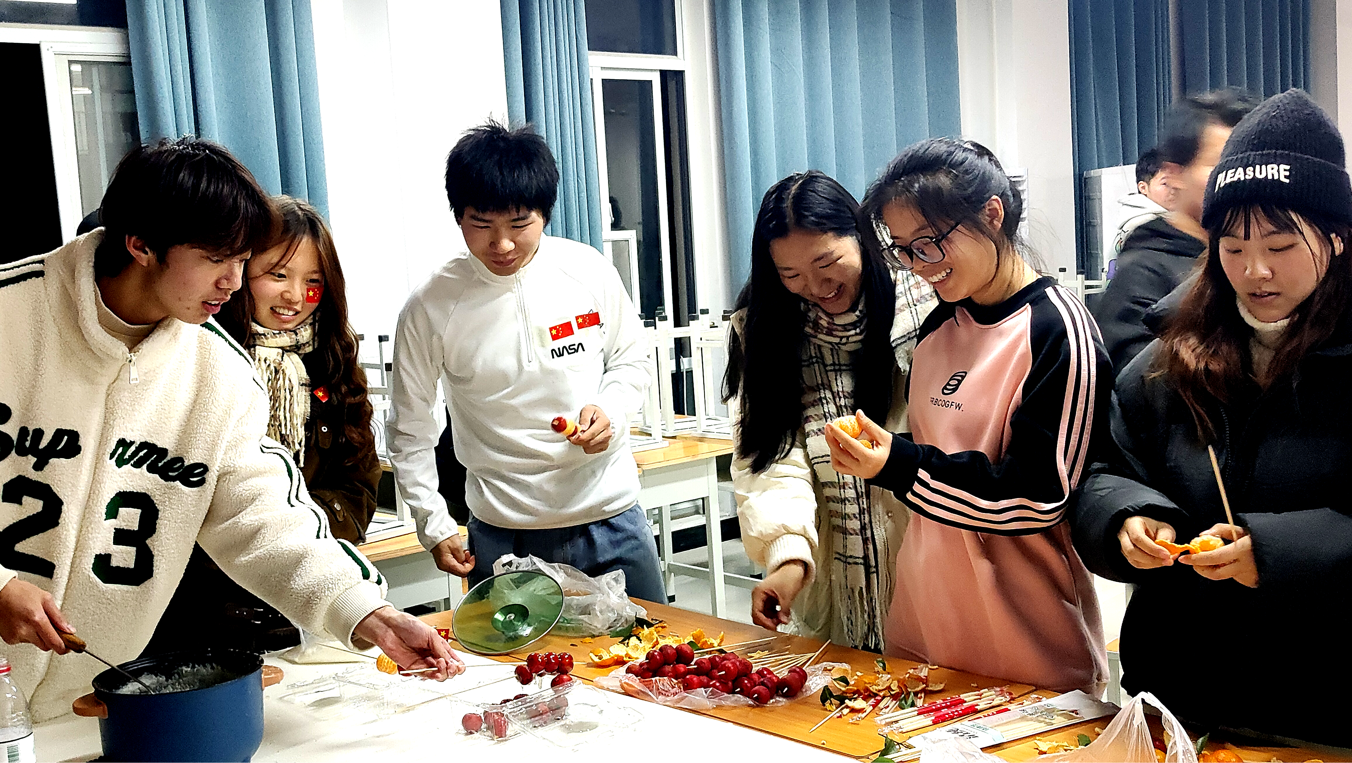 同学们根据自己的搭配灵感,用糖葫芦签子将不同水果块串起来,学着熬糖浆,再用勺子将煮好的糖浆水均匀地浇在山楂串上……