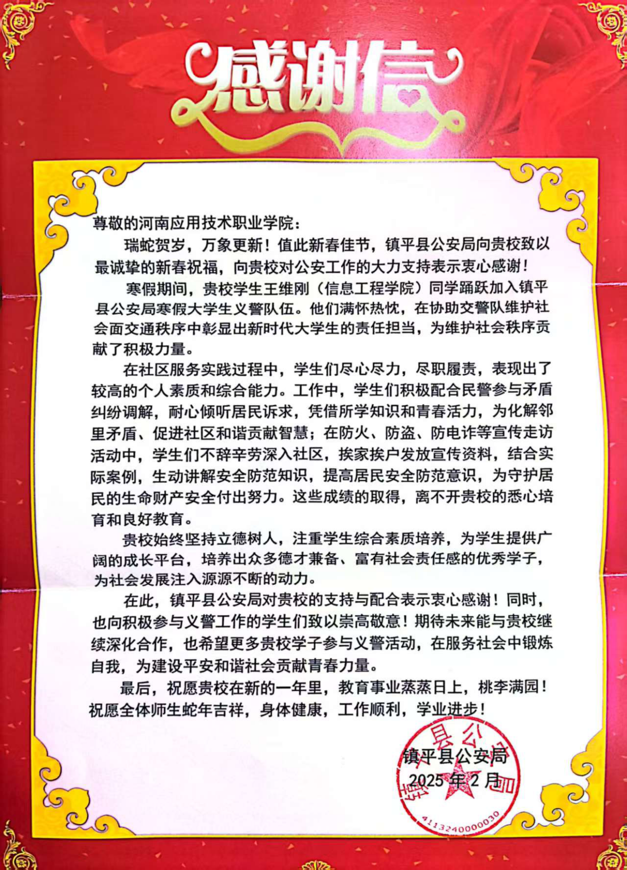 2月21日,yl6809永利官网收到来自河南省南阳市镇平县公安局的感谢信,信中表达了对我院学生王维刚寒假期间加入镇平县公安局寒假大学生义务警队,协助指挥交通、维护交通秩序的赞扬,也对学校育人成果表示感谢。