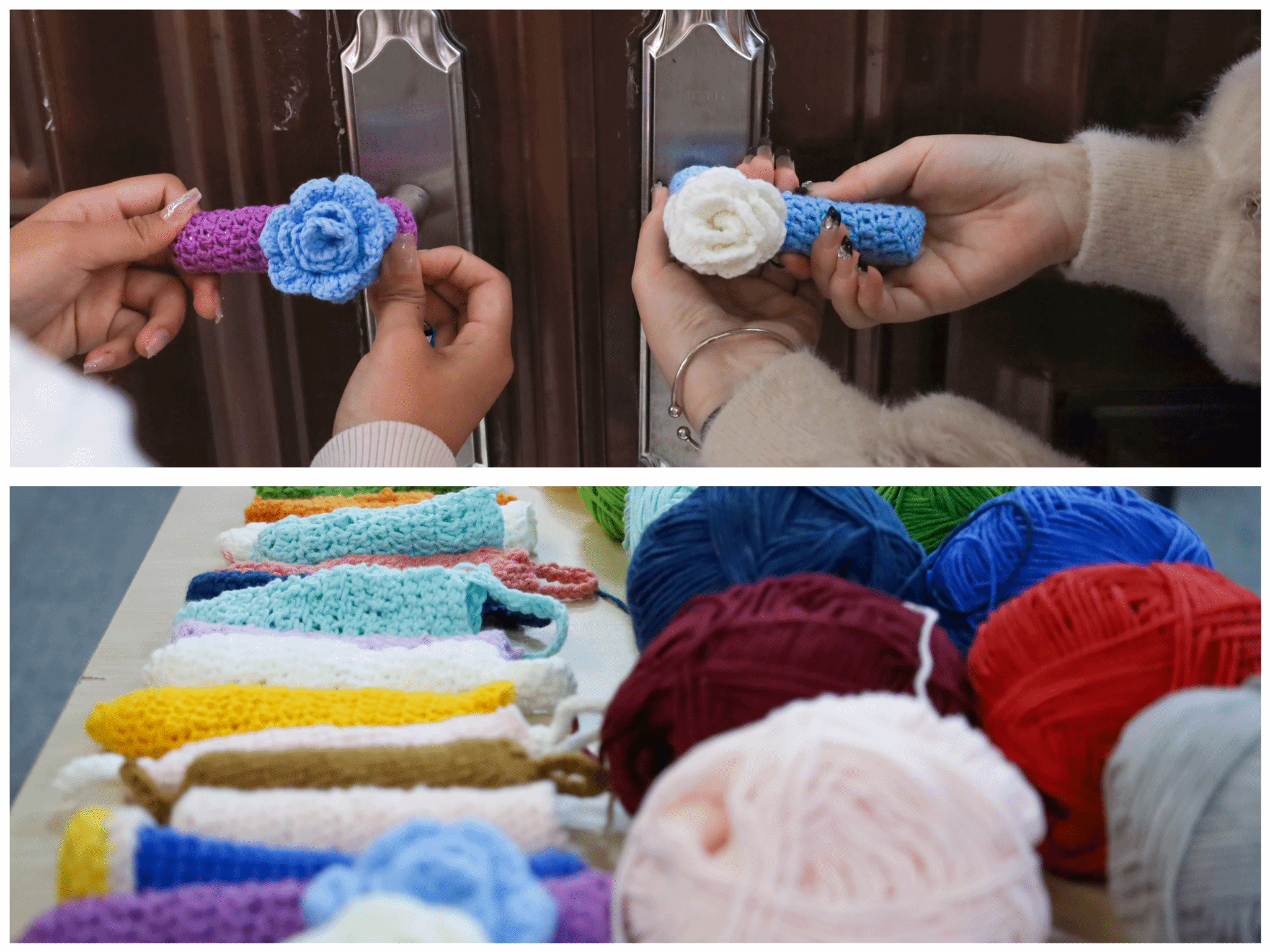 22团颜色各异的精梳棉毛线团和50余根软柄钩针是制作门把手“保暖外套”的全部材料,看似简易的制作材料在学生们手中却呈现出新花样。粉白交错的兔耳朵、花瓣层层重叠的玫瑰、海浪状的纹路……制作者“各显神通”,用多种元素点缀防寒门把手套,为教室门把手换上“新衣”。