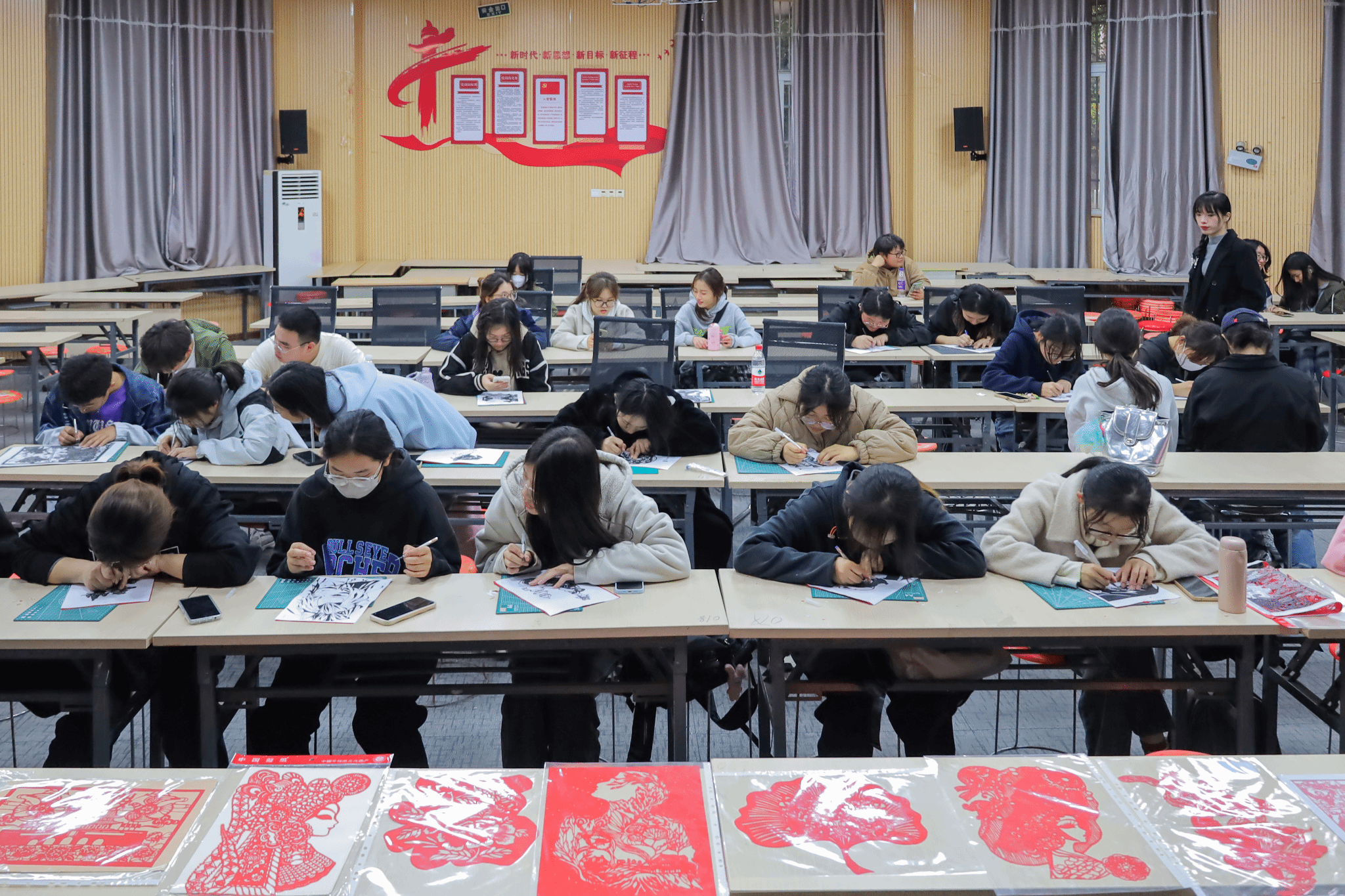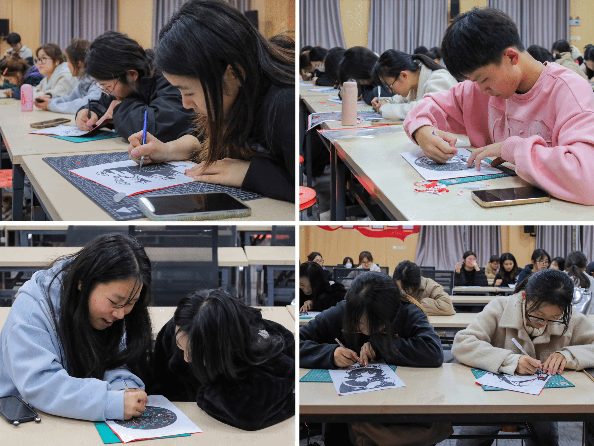 一张红纸、一把刻刀、一份垫板,在一笔一划的雕刻中,二十余份剪纸作品纷纷“亮相”。11月26日,Beat365官方网站在学院学术报告厅开展“绘梦青春,共‘剪’朝夕”活动,70余名学子手持刻刀,在与剪纸的“面对面”接触中体验非遗文化。