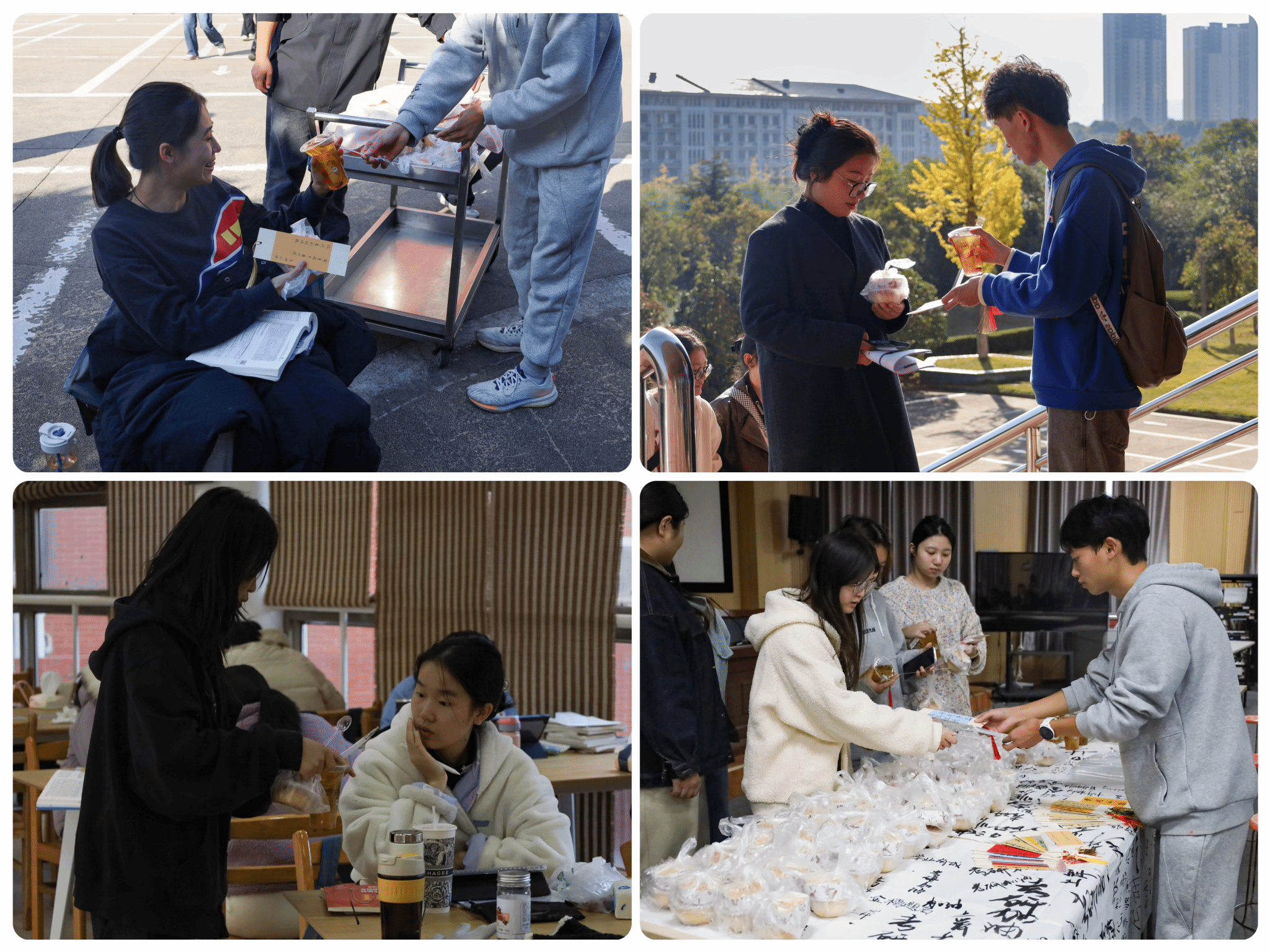 志愿者们到达食堂后厨后,有的掌勺分杯盛放银耳雪梨羹,有的则将刚出烤箱的面包分类装盒、密封包装,最终将它们一并放到小推车内,手携手工礼物,前往图书馆与学院报告厅,为来往的考研学子送去礼包与祝福。“有的学长学姐走路都在看书,希望我们准备的加油礼包可以为他们紧张的生活减去一份压力,带去一份温暖。”设计学类专业2023(3)班的高秀英说。