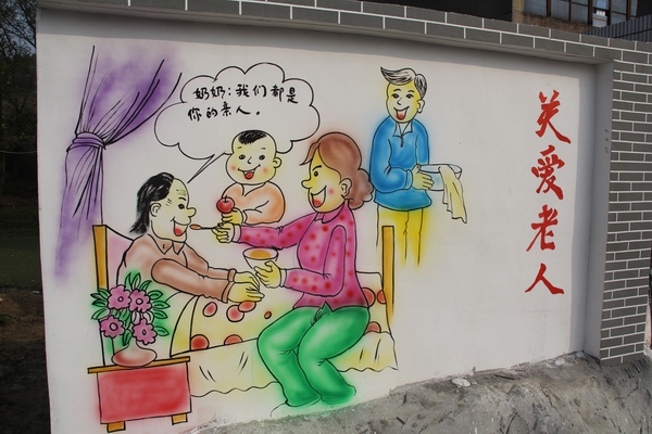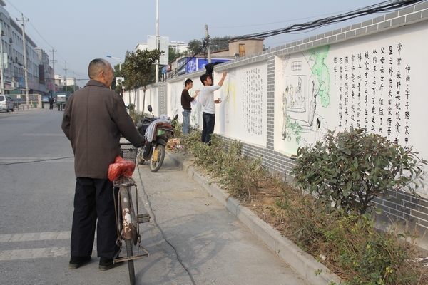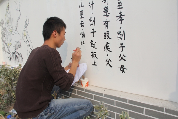 走出学校东门,映入眼帘的是一幅幅绘制在马路两边“二十四孝”墙体彩绘宣传画:《涌泉跃鲤》、《哭竹生笋》、《弃官寻母》……一个个孝道故事在他们的笔下栩栩如生地绘制在墙壁上。来来往往的行人经过这里时都纷纷停下脚步,欣赏墙上的一幅幅精美的画,有的行人拿出手机进行拍摄,有的会与学生进行交流。这些主题鲜明、绘制精美的主题宣传画全部出自于Beat365官方网站墙体彩绘工作室的学生之手。他们利用课余时间,发挥自身专业特长,纯手工绘画,书写文字,他们在绘画的同时,也享受着为社区增添一份美丽的快乐。