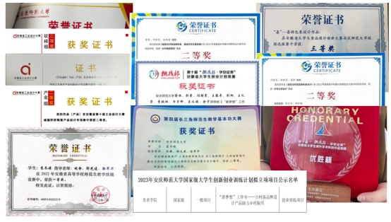 研究生在专业创作、职能技能等学术竞赛活动中共成果丰硕。其中杨光同学在第二届安徽省乡村振兴创新创业大赛中荣获一等奖,还在教育部学位中心举办的中国研究生乡村振兴志愿服务活动中获“优秀志愿者”称号;袁冬晴同学在第四届安徽省大学生绘画作品大赛中获省级二等奖、2023安徽省大学生原创动漫大赛中获省级三等奖、安徽省乡村振兴创新创业大赛中获省级二等奖、第十一届“挑战杯·华安证券”安徽省大学生创业计划中荣获银奖等。